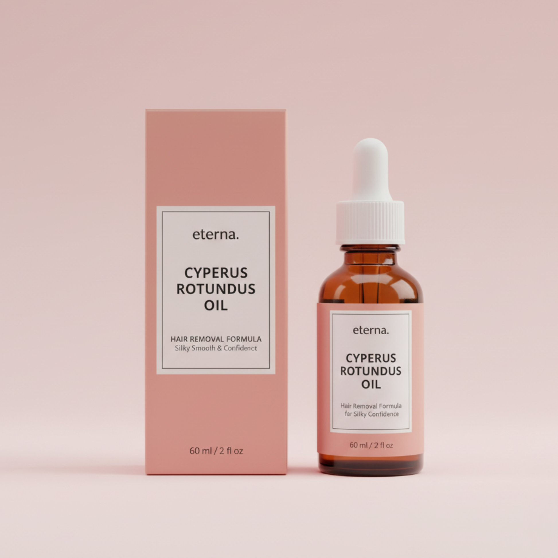 Si farvel til uønsket hår med Eterna sin Cyperus Rotundus-olje. Klinisk bevist å redusere hårvekst over tid, og full av naturlige ingredienser som gir skånsomme og smertefrie resultater. Opplev en glattere og mykere hud – naturlig og uten anstrengelse.